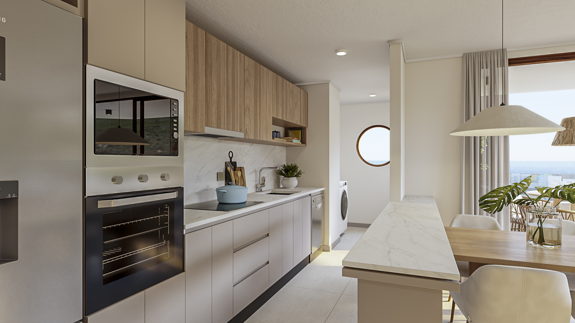 - Cocinas equipadas con cubierta de Porcelanato gran formato estilo mármol blanco, encimera vitrocerámica, horno eléctrico, microondas empotrado y campana retráctil.