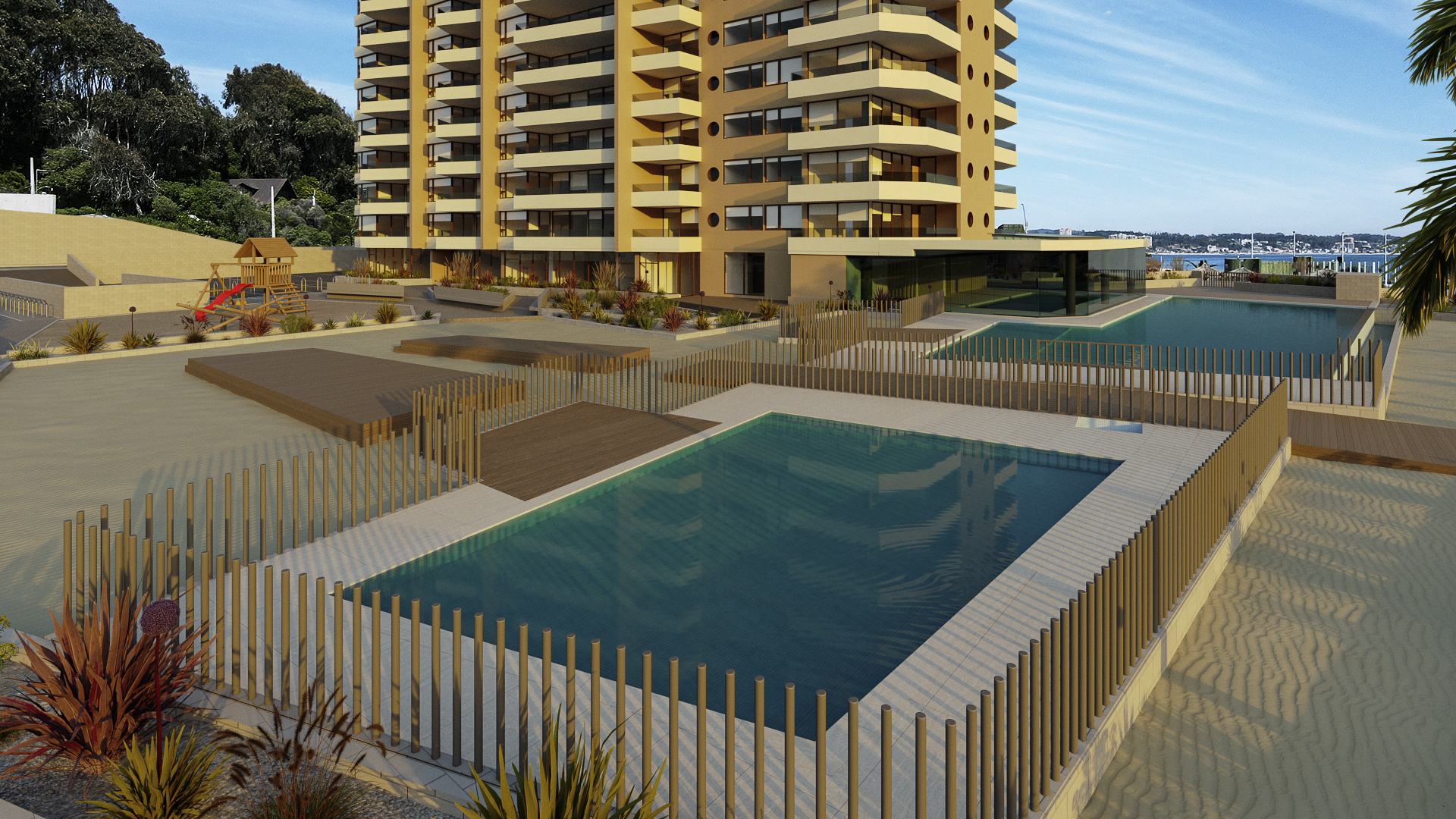 - Piscina para niños en exterior y una espectacular piscina temperada, con cristales y vista panorámica a la playa.